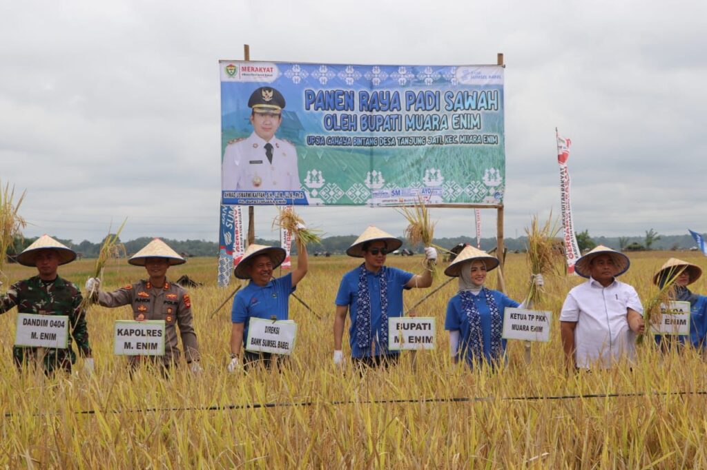 MuaraEnim, beritamuaraenim.com – Pelaksana Tugas (Plt.) Bupati Muara Enim Ahmad Usmarwi Kaffah bersama Sekda Muara Enim Yulius serta Unsur Forum Komunikasi Pimpinan Daerah Kabupaten Muara Enim melakukan Panen Raya Padi IP 200 di Desa Tanjung Jati Kecamatan Muara Enim yang merupakan wujud komitmen Kabupaten Muara Enim dalam mendukung Sumatera Selatan (Sumsel) Lumbung Pangan, Rabu (3/5/2023).