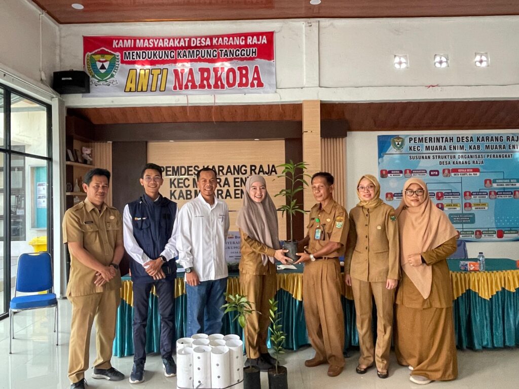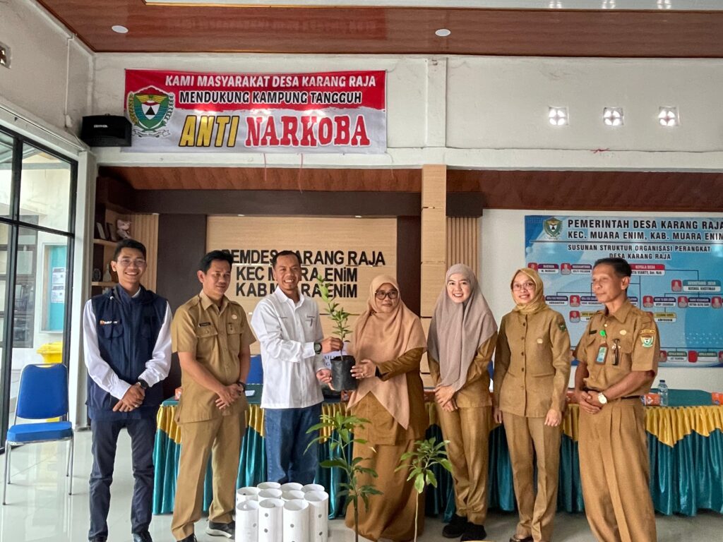 MuaraEnim, beritamuaraenim.com – PT Bukit Asam Tbk (PTBA) menegaskan komitmennya dalam mendukung inisiatif keberlanjutan lingkungan dengan memberikan bantuan stimulan kepada Desa Karang Raja dalam rangka program Kampung Iklim (Proklim). Bantuan berupa 50 bibit tanaman buah (mangga, durian, alpukat, dan pete) serta 50 pipa biopori diserahkan secara simbolis kepada Pemerintah Desa Karang Raja di Kantor Desa Karang Raja, Kecamatan Muara Enim, yang turut disaksikan oleh perwakilan Dinas Lingkungan Hidup (DLH) Kabupaten Muara Enim pada Senin, 23 Juni 2025.